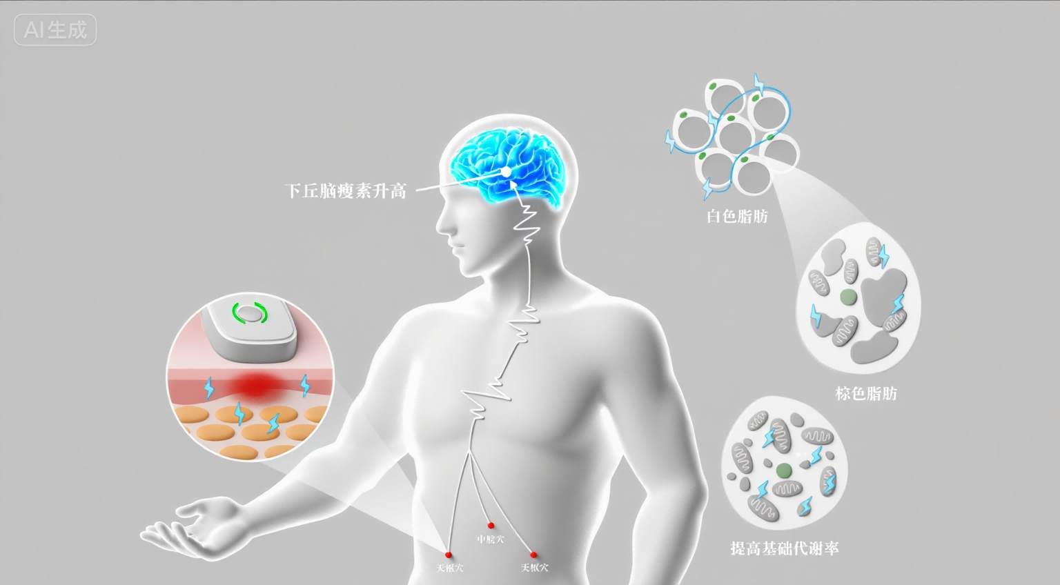 Stimulates acupoints to enhance fatty acid oxidation, targeting stubborn fat.